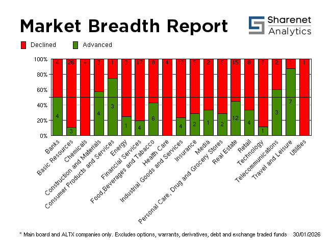 | 29/01/2026 | 170 | 207 | 32 | 409 | 326,817,902 | R34,525,704,062 | 485165 | 6089614 | | 28/01/2026 | 218 | 182 | 27 | 427 | 245,764,571 | R29,362,670,143 | 445954 | 5676103 | | 27/01/2026 | 210 | 211 | 31 | 452 | 322,582,545 | R30,893,572,959 | 457372 | 5583336 | | 26/01/2026 | 220 | 182 | 26 | 428 | 334,790,611 | R26,856,514,595 | 415587 | 5430737 | | 23/01/2026 | 171 | 204 | 26 | 401 | 251,964,857 | R28,414,426,797 | 402243 | 5786014 | * Includes all listed instruments on the JSE