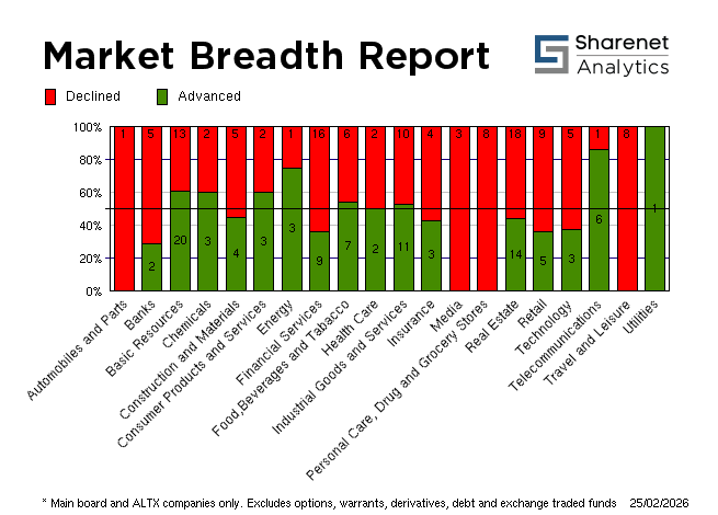 | 25/02/2026 | 230 | 164 | 34 | 428 | 288,775,748 | R25,227,506,265 | 420680 | 3598568 | | 24/02/2026 | 183 | 244 | 37 | 464 | 225,018,222 | R20,788,308,650 | 318010 | 4511660 | | 23/02/2026 | 256 | 151 | 32 | 439 | 243,253,413 | R23,261,716,899 | 417238 | 5154007 | | 20/02/2026 | 190 | 178 | 25 | 393 | 248,659,101 | R23,098,757,851 | 308154 | 4476796 | | 19/02/2026 | 180 | 194 | 26 | 400 | 264,094,984 | R24,914,747,134 | 320387 | 5651018 | * Includes all listed instruments on the JSE