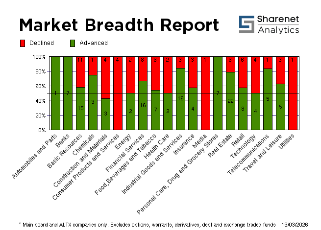 | 16/03/2026 | 235 | 161 | 31 | 427 | 360,529,105 | R37,065,755,247 | 509200 | 8986704 | | 13/03/2026 | 153 | 224 | 27 | 404 | 332,570,076 | R33,973,641,695 | 505209 | 6987091 | | 12/03/2026 | 160 | 235 | 25 | 420 | 314,325,085 | R28,331,206,058 | 425689 | 8919473 | | 11/03/2026 | 138 | 234 | 22 | 394 | 315,678,666 | R29,090,873,230 | 482614 | 7981982 | | 10/03/2026 | 288 | 156 | 30 | 474 | 404,775,595 | R34,469,325,050 | 541822 | 7922309 | * Includes all listed instruments on the JSE