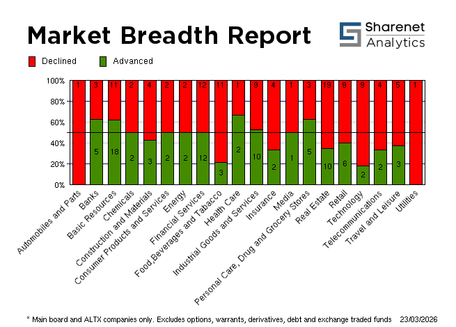 | 23/03/2026 | 173 | 228 | 33 | 434 | 457,203,354 | R40,591,593,752 | 594695 | 6540917 | | 20/03/2026 | 178 | 188 | 34 | 400 | 791,153,881 | R74,348,052,051 | 602450 | 6872766 | | 19/03/2026 | 86 | 310 | 25 | 421 | 660,305,818 | R84,916,669,145 | 629095 | 7183586 | | 18/03/2026 | 154 | 234 | 29 | 417 | 343,079,120 | R37,496,209,840 | 556075 | 7300354 | | 17/03/2026 | 257 | 155 | 53 | 465 | 335,973,118 | R37,333,863,962 | 523963 | 7618021 | * Includes all listed instruments on the JSE
