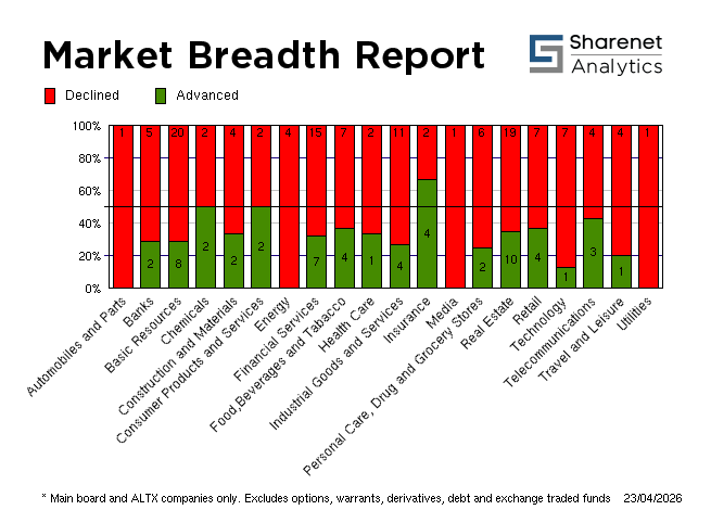 | 20/04/2026 | 182 | 206 | 26 | 414 | 259,334,467 | R18,150,233,214 | 315088 | 0 | | 17/04/2026 | 272 | 110 | 27 | 409 | 303,879,820 | R30,991,629,386 | 473886 | 0 | | 16/04/2026 | 223 | 166 | 32 | 421 | 215,704,495 | R21,581,191,749 | 306822 | 0 | | 15/04/2026 | 229 | 145 | 29 | 403 | 258,479,450 | R24,693,782,837 | 387510 | 0 | | 14/04/2026 | 340 | 97 | 18 | 455 | 256,277,390 | R23,213,564,966 | 349778 | 0 | * Includes all listed instruments on the JSE